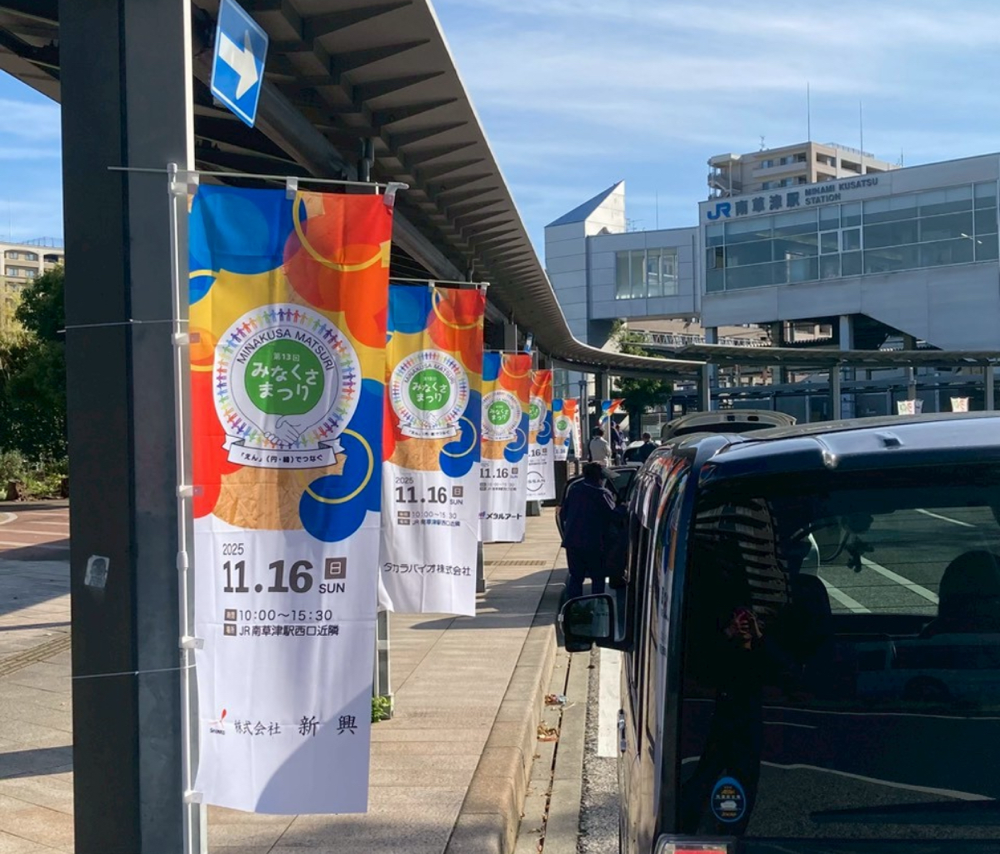 第13回みなくさまつりの準備も着々と進んでいますが、JR南草津駅ロータリーにのぼりの設置も完了しております!協賛社の皆様、誠に有難うございます!