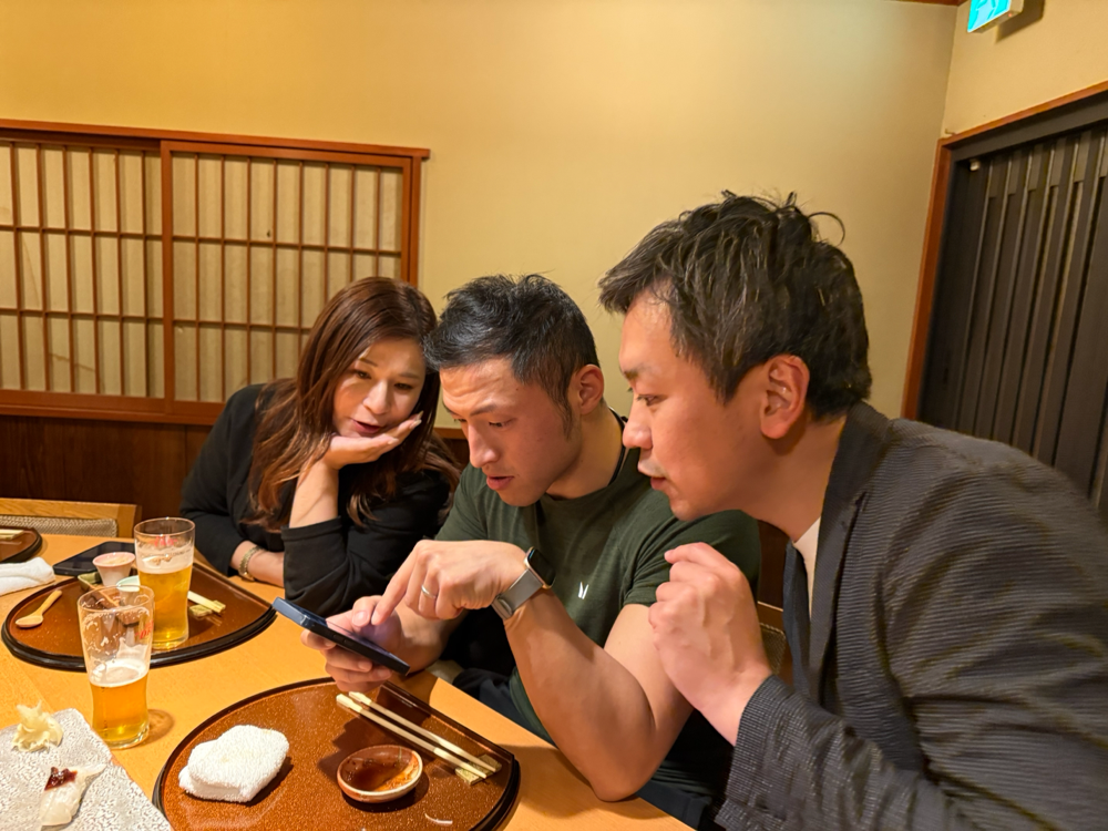 赤のりゅうじコト、代表の中桐です。 繁忙期がようやく一段落というコトで、草津市のそれぞれ店舗経営をされている経営者仲間と某店にて。 この日、経営者仲間がキックボクシングのチャンピオンになったとか!写真はその中継を観ているようす。